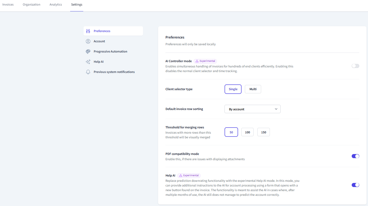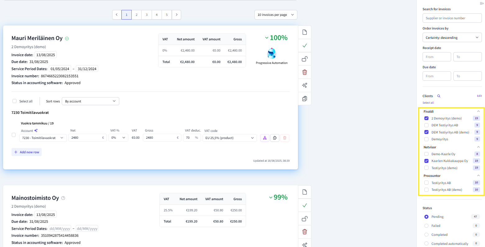 Client selector type determines whether you can handle invoices for only one or multiple clients on the same page in the FabricAI portal. If you choose 'Multi', you can select multiple clients at the same time on the right side of the invoice view, whose invoices will be listed simultaneously for allocation. 'Single' does not allow selecting more than one client at a time. Below is an example of multi: