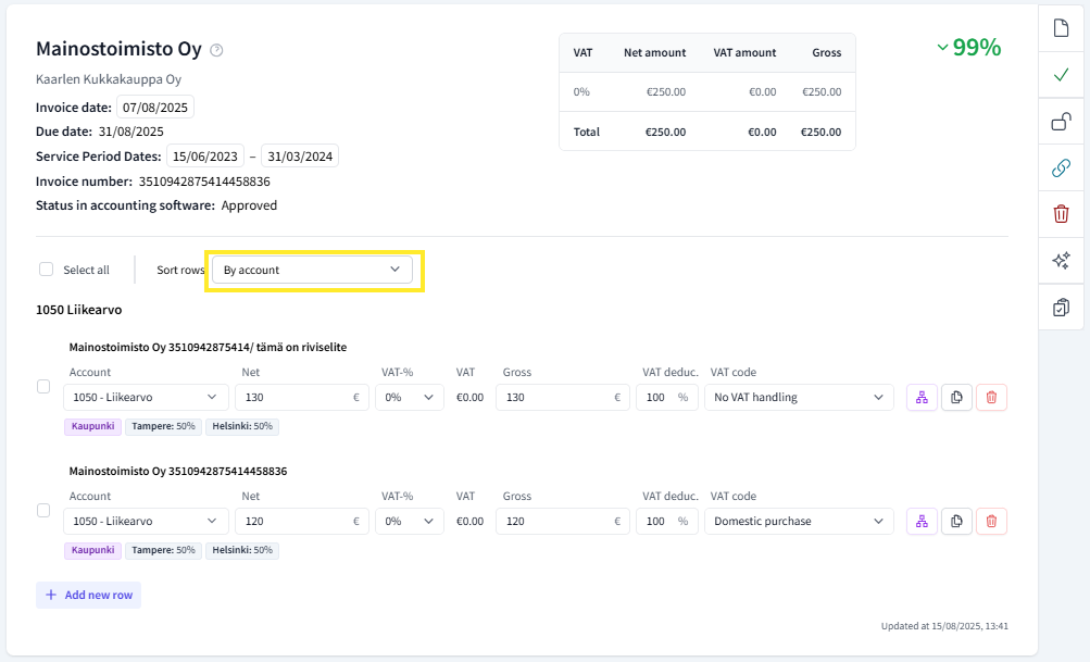 Default invoice row sorting as the name suggests, determines the order in which allocation rows appear in the invoice view. Rows can be sorted by account, gross total, VAT, or alphabetically, or in the original order. This setting only affects the default order, and the order can also be changed per invoice in the allocation view (see the next image).