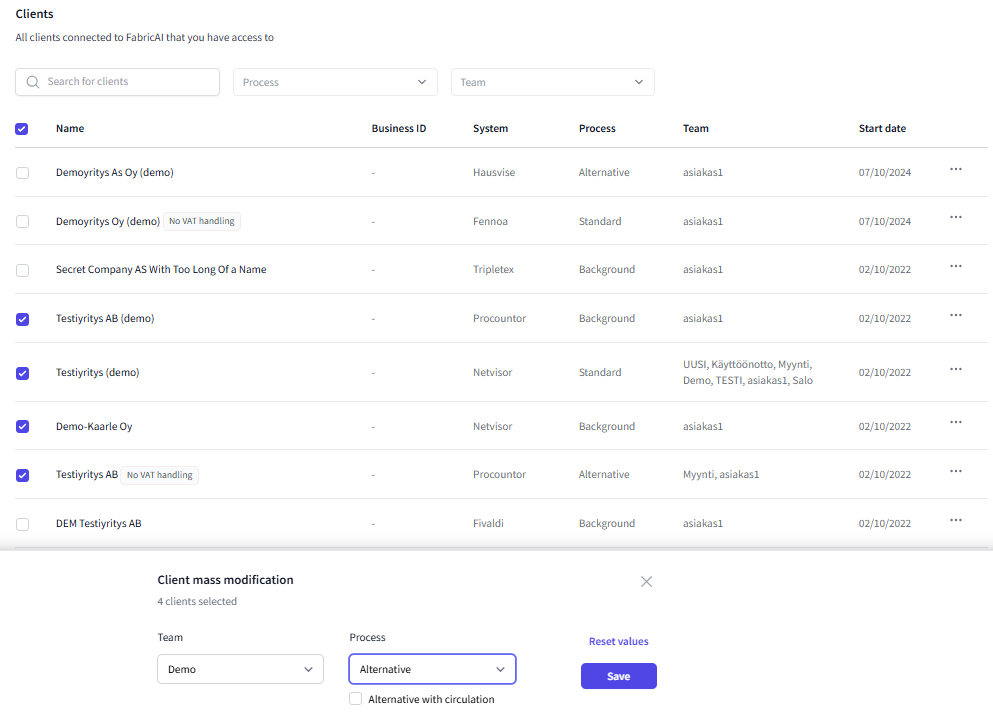 - You can change the team and process at the same time. Note that the process options depend on the accounting software. Only for Netvisor and Procountor clients, when you select the Alternative process, a checkbox "Alternative with circulation" will also appear. Use this when you want to set circulation in the FabricAI portal.