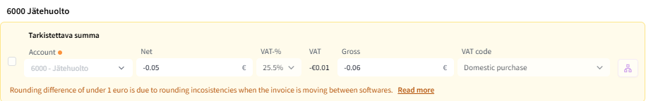 In the FabricAI portal, you may see "Amount to be checked" ("Tarkistettava summa") lines with a yellow background on some invoices. Such lines occur because the invoice supplier has created the invoice mathematically incorrectly, meaning the declared total amount of the purchase invoice and the total amount calculated through the purchase invoice lines do not match. Often, the amount of such a line is a cent or a few cents.