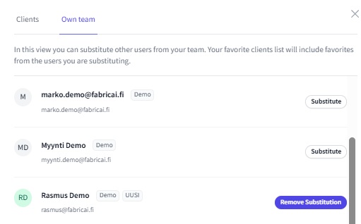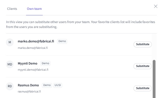 On the Own team tab, you see all other FabricAI users of your accounting firm or team. By clicking "Substitute" next to a user, you can also select a colleague's favorite clients to be visible in your client selection with one click.