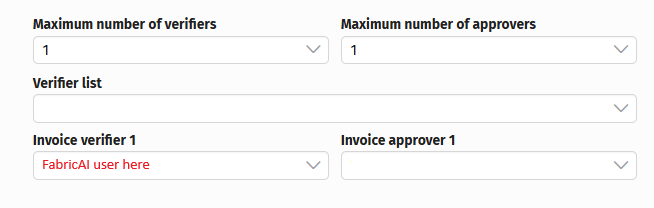 In the FabricAI portal, it is not possible to select (nor automate) directing an invoice to an individual person/people or default circulation, but to an verifier list. Therefore, it would be important to create such lists and name them as clearly as possible. The name should ideally indicate any possible connection to a specific cost center, for example. NOTE! The accountant/accounts manager using FabricAI may not necessarily need to be included in these, as it would require actions from them in Procountor. Additionally, you can of course create a verifier list with only one person.