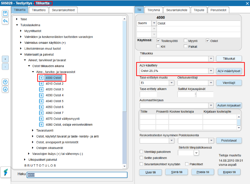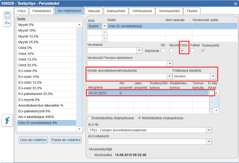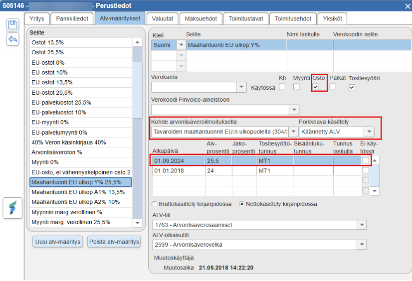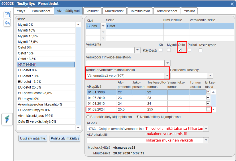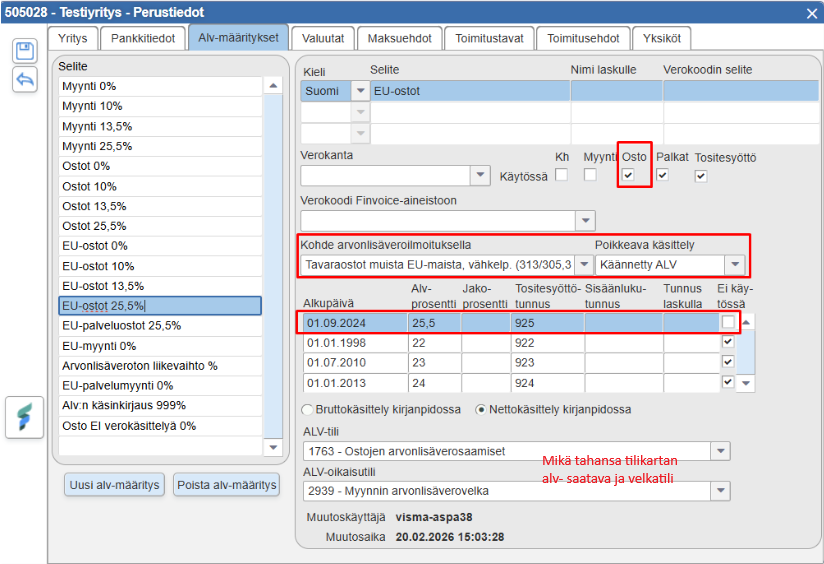 To ensure FabricAI works optimally with Fivaldi, it is important that the tax rates are set in Fivaldi according to the following points. Please note that these settings are available only in Finnish in Fivaldi. Following the Finnish instructions may be easier for this part.
