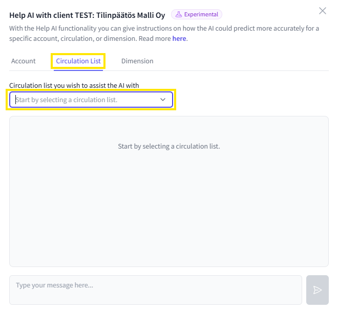 3. Select from the dropdown menu the circulation list you want to automate. You can write a help instruction for AI in the same way as when guiding an account. Additionally, specifically for circulations, AI can be instructed based on the predicted dimension or account, for example, with such help instructions:
