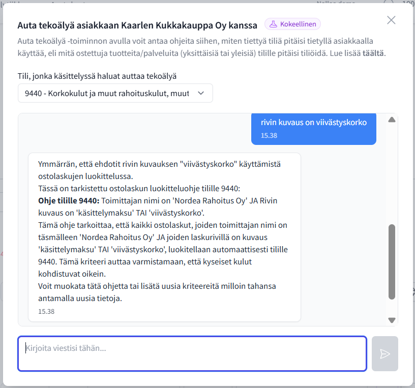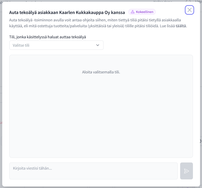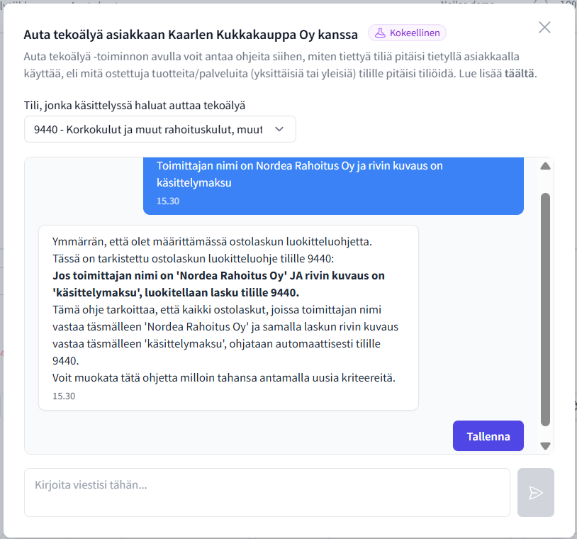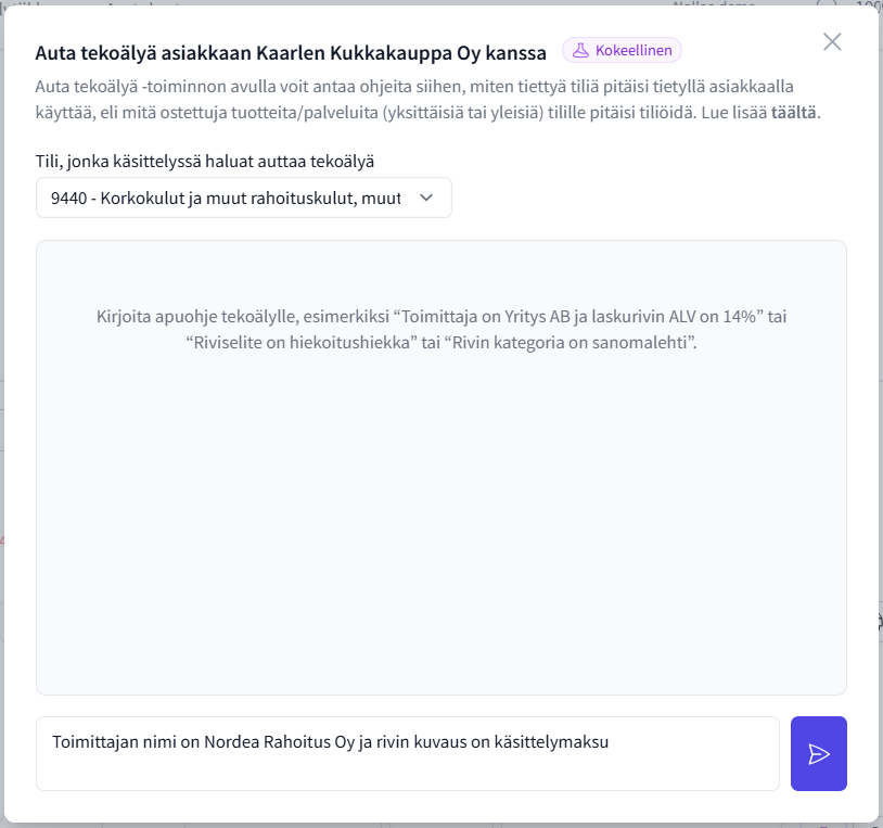 - Tekoäly ei ymmärrä tällä hetkellä negaatioita, eli kerro aina miten tiliä kuuluisi käyttää (eli mitä tai miten sinne pitäisi tiliöidä), eikä miten tiliä ei kuuluisi käyttää tai mitä tuotteita/palveluita tilille ei saisi tiliöidä