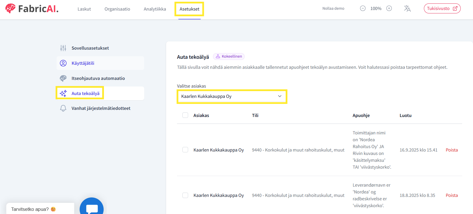 Jos haluat myöhemmin tarkastella, mitä ohjeita asiakkaalle on tallennettuna tai poistaa niitä, mene FabricAI-portaalissa ”Asetukset” -välilehdelle ja valitse vasemmasta sivuvalikosta ”Auta tekoälyä”. Tallennetut ohjeet listautuvat tähän näkymään, ja voit poistaa niitä yksitellen kunkin ohjeen kohdalla oikeasta reunasta.
