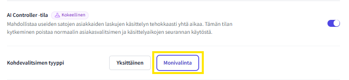 18.12.2025 FabricAI-portaaliin julkaistiin päivitys, jonka myötä AI Controller-tilassa on myös mahdollista valita useita tiimejä tai asiakkaita käsiteltäväksi kerralla. Voit ottaa tämän ominaisuuden käyttöön valitsemalla asetuksissa AI Controller -tilan alta "Kohdevalitsimen tyyppi" -> "Monivalinta".