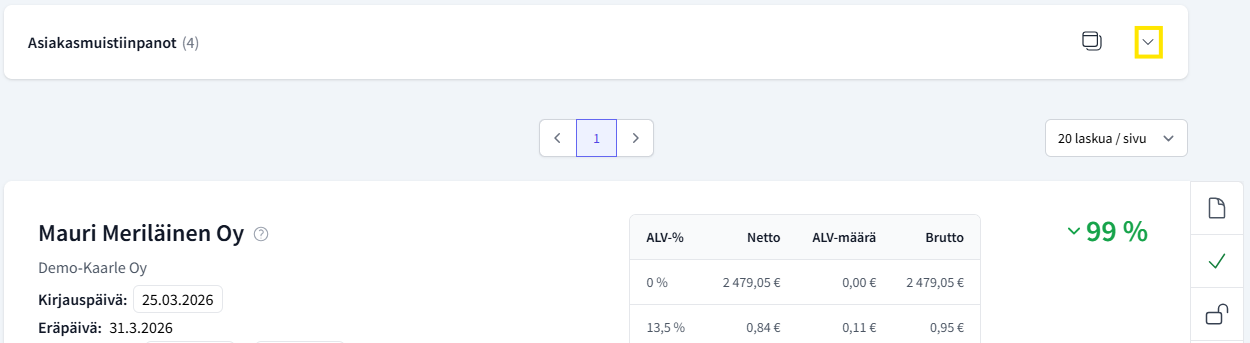 Toiminnallisuus löytyy laskulistauksen yläpuolelta kohdasta Asiakasmuistiinpanot.