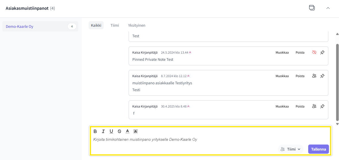 Tiimi: Merkintä näkyy kaikille käyttäjille, joilla on oikeudet kyseiseen asiakkaaseen. Tämä sopii erinomaisesti ohjeistuksiin, kuten: "Muista osittainen alv-vähennysoikeus 65 % K-Raudan laskuilla."