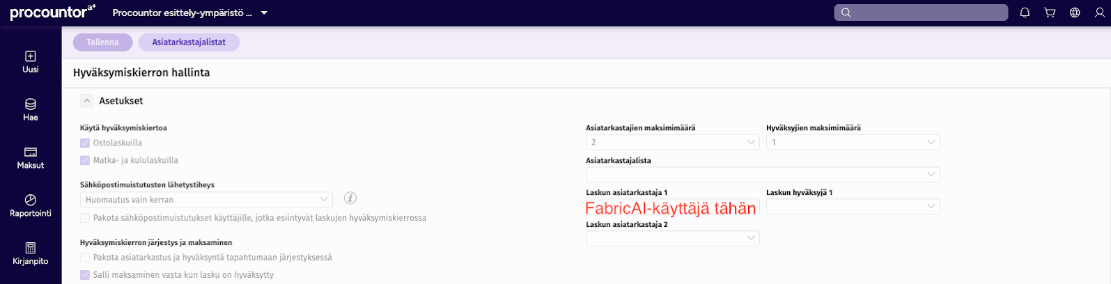 Huom! Jotta FabricAI-prosessi toimisi oikein, olisi tärkeää, että Procountorissa ei olisi luotuna eri nimillä muuten identtisiä asiatarkastajalistoja. Tämä siksi, että FabricAI tunnistaa kierrot henkilöiden perusteella.