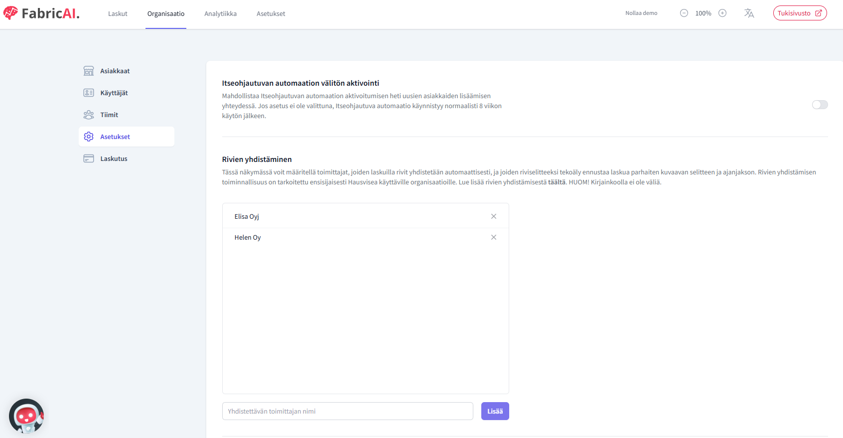 FabricAI-portaalin ”Organisaatio”-välilehdellä ”Asetukset”-valikosta organisaation ylläpitäjä pääsee määrittämään koko organisaation FabricAI:n kautta kulkeneiden toimittajien osalta ne toimittajat, joille kaikilla asiakkailla rivit supistuvat automaattisesti, ennen kuin laskut nousevat FabricAI-portaaliin.