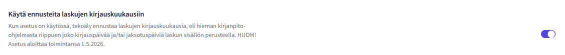 Aiemmin kirjauskuukausia on ennustettu tässä artikkelissa kuvatulla tavalla. Vanhassa tavassa korostui se, että toimittajalle oli aiemmin pitänyt muuttaa FabricAI:ssa kirjauspäivää, jotta ennustaminen käynnistyy. 1.5.2026 alkaen tekoäly ennustaa kirjauspäivää aina, kun laskulta löytyy jokin laskun päivästä poikkeava jakso. Sama pätee jaksotuksiin, mikäli laskun summa ylittää 200€.