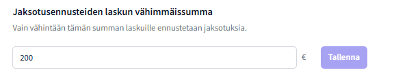 Edellisen kohdan alta löydät jaksotusennusteiden vähimmäissumman hallinnoinnin. Jos haluat, että jaksotuksia ennustetaan esimerkiksi vain yli 500€ tai 1000€ laskuille, päivitä summaraja haluamaasi kohtaan. Asetus koskee kaikkia organisaation asiakkaita.