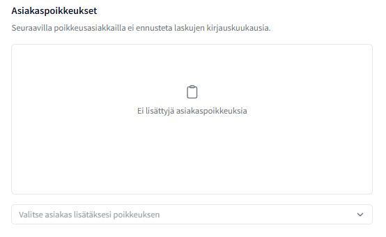 Jaksotussummarajan alta löydät asiakaspoikkeuksien hallinnoinnin. Tämä kohta on olennainen vain, jos pidät ensimmäistä kohtaa valittuna ja haluat kieltää kirjauskuukausiennusteet tietyiltä asiakkailta. Lisää kohtaan sellainen asiakas/asiakkaat, jolla et halua, että kirjauskuukausia ennustetaan.