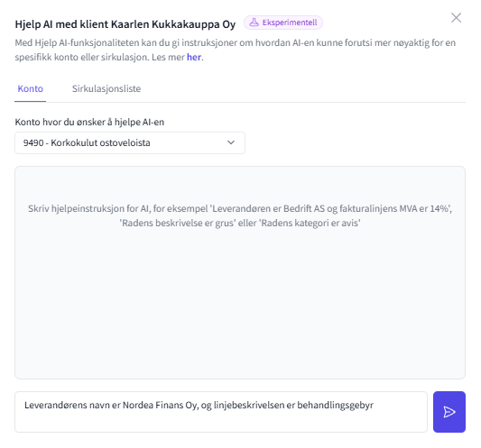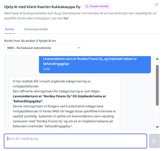 FabricAI har lagt til en ny eksperimentell funksjon i slutten av juni 2025, som lar deg som bruker hjelpe ai-en med naturlig språk, spesielt i tilfeller der ai-en ikke klarer å forutsi kontoen riktig etter et par måneders bruk. I tillegg kan funksjonen automatisere sirkulasjoner hvis Alternativ med sirkulasjon-prosessen er i bruk. Hjelp ai er først tilgjengelig kun for å forbedre kontoens prognoser, men senere også for prognoser av dimensjoner. Funksjonen er foreløpig klientspesifikk, men vårt mål er å senere implementere muligheten til å lage hjelpeinstruksjoner for flere klienter samtidig.