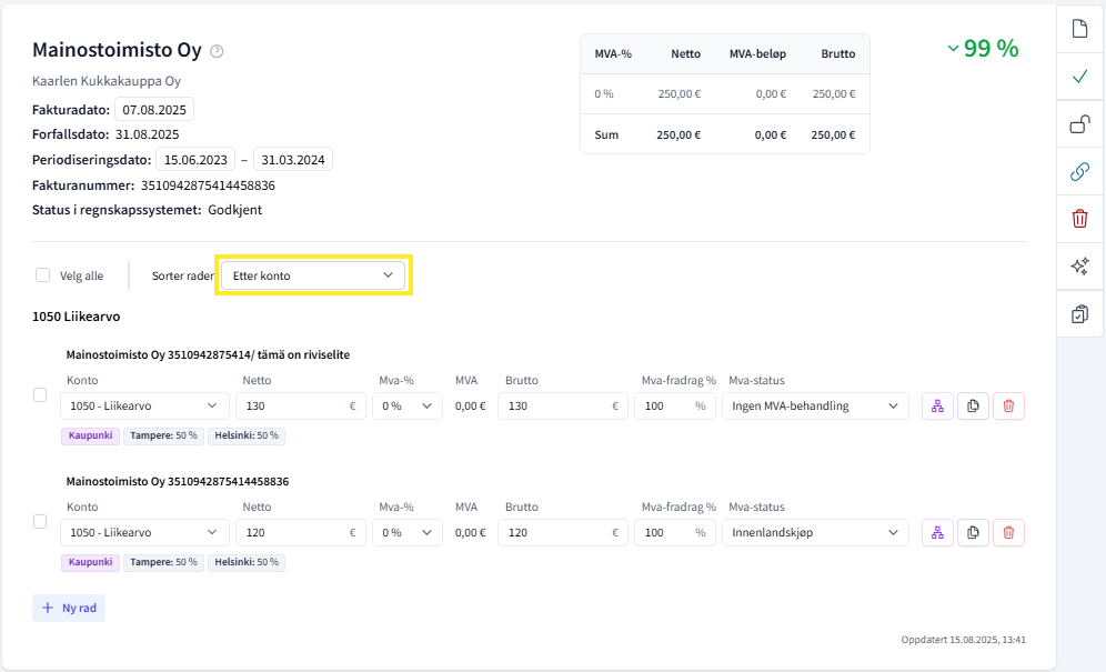 Standard sortering bestemmer, som navnet antyder, i hvilken rekkefølge bokføringslinjene vises i fakturavisningen. Linjene kan sorteres etter konto, bruttosum, mva eller alfabetisk rekkefølge, eller i original rekkefølge. Denne innstillingen påvirker kun standard rekkefølge, og rekkefølgen kan også endres per faktura i bokføringsvisningen (se neste bilde).