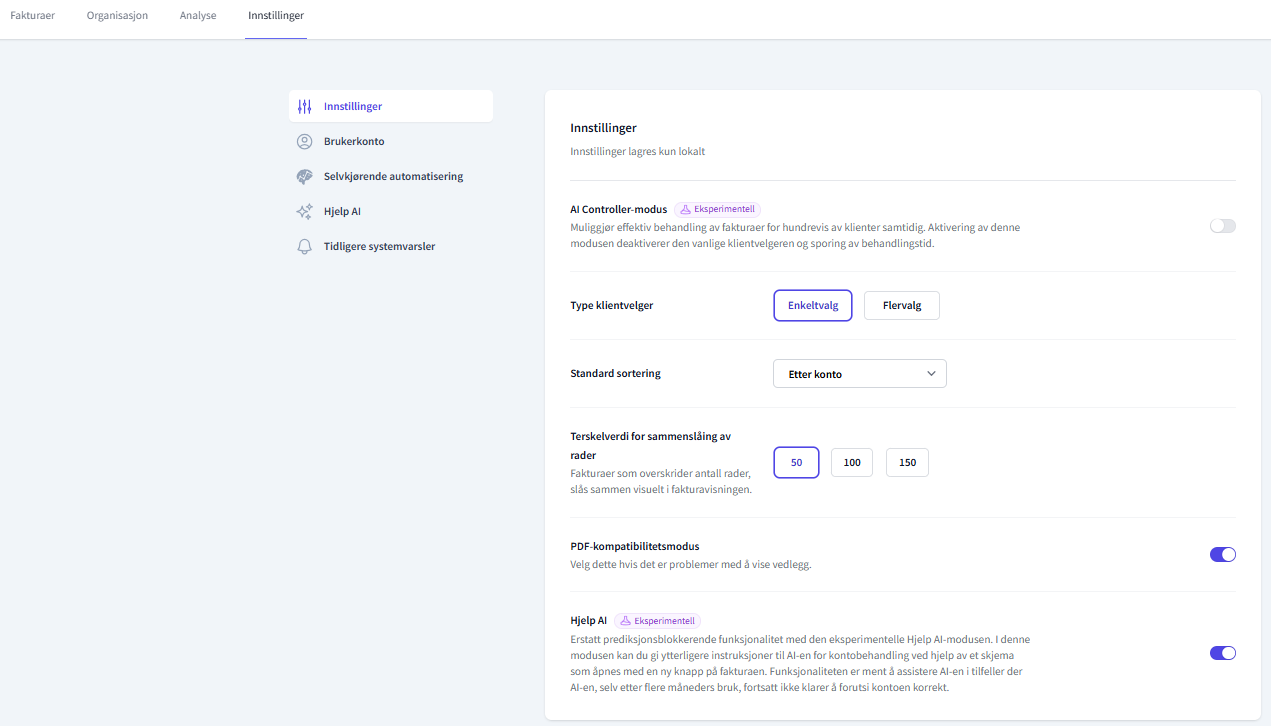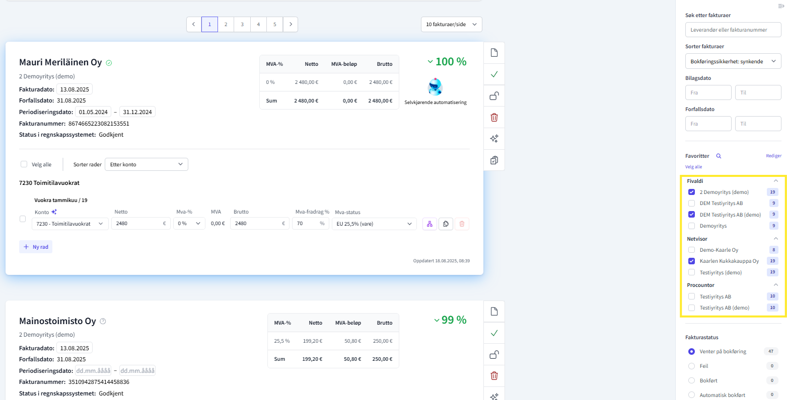 Type klientvelger bestemmer om du kan håndtere fakturaer for bare én eller flere klienter samtidig på samme side i FabricAI-portalen. Hvis du velger 'Flervalg', kan du på høyre side av fakturavisningen velge flere klienter samtidig, hvis fakturaer vil bli listet samtidig for bokføring. 'Enkeltvalg' tillater ikke å velge flere klienter samtidig. Bildet nedenfor viser et eksempel på flervalg: