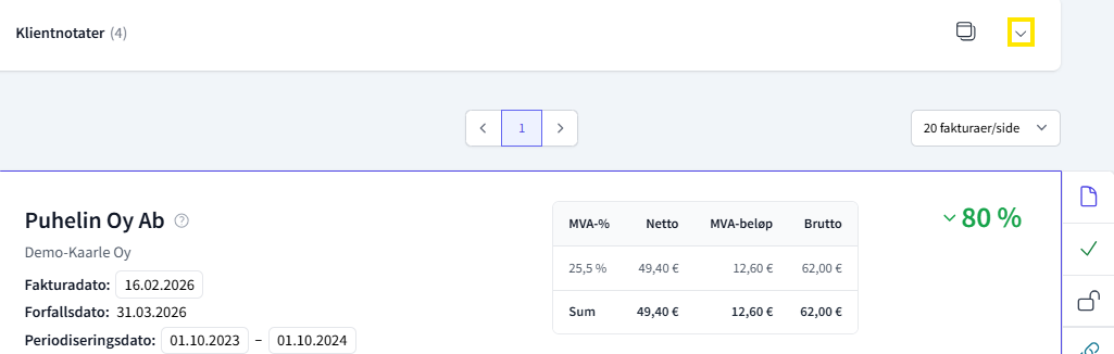 Klientnotater har som mål å holde relevante opplysninger lett synlige for hver klient når fakturaene til den aktuelle klienten behandles. Funksjonen er tilgjengelig i FabricAI-portalen i fakturavisningen, og den vises selv om den valgte klienten ikke har noen åpne fakturaer for øyeblikket.
