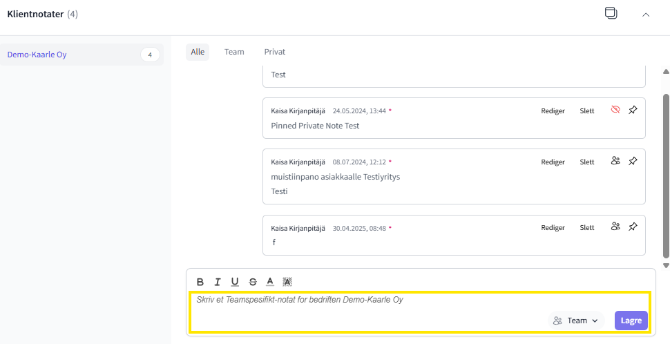 Team: Oppføringen er synlig for alle brukere som har tilgang til den aktuelle klienten. Dette passer utmerket for instruksjoner, som: "Husk delvis mva-fradragsrett 65 % på K-Raudas fakturaer."
