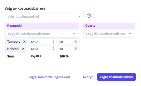 Knappen åpner et dimensjonsvalg-vindu hvor det også er mulig å dele fakturaens sum i deler til forskjellige dimensjoner, for eksempel som prosentandeler. Les mer om allokeringer i FabricAI her.
