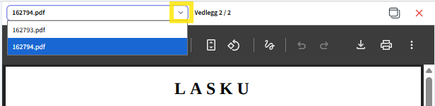 Du kan bla gjennom vedleggene ved først å åpne fakturabildet og deretter klikke på den lille pilen som peker nedover ved siden av vedleggets navn.