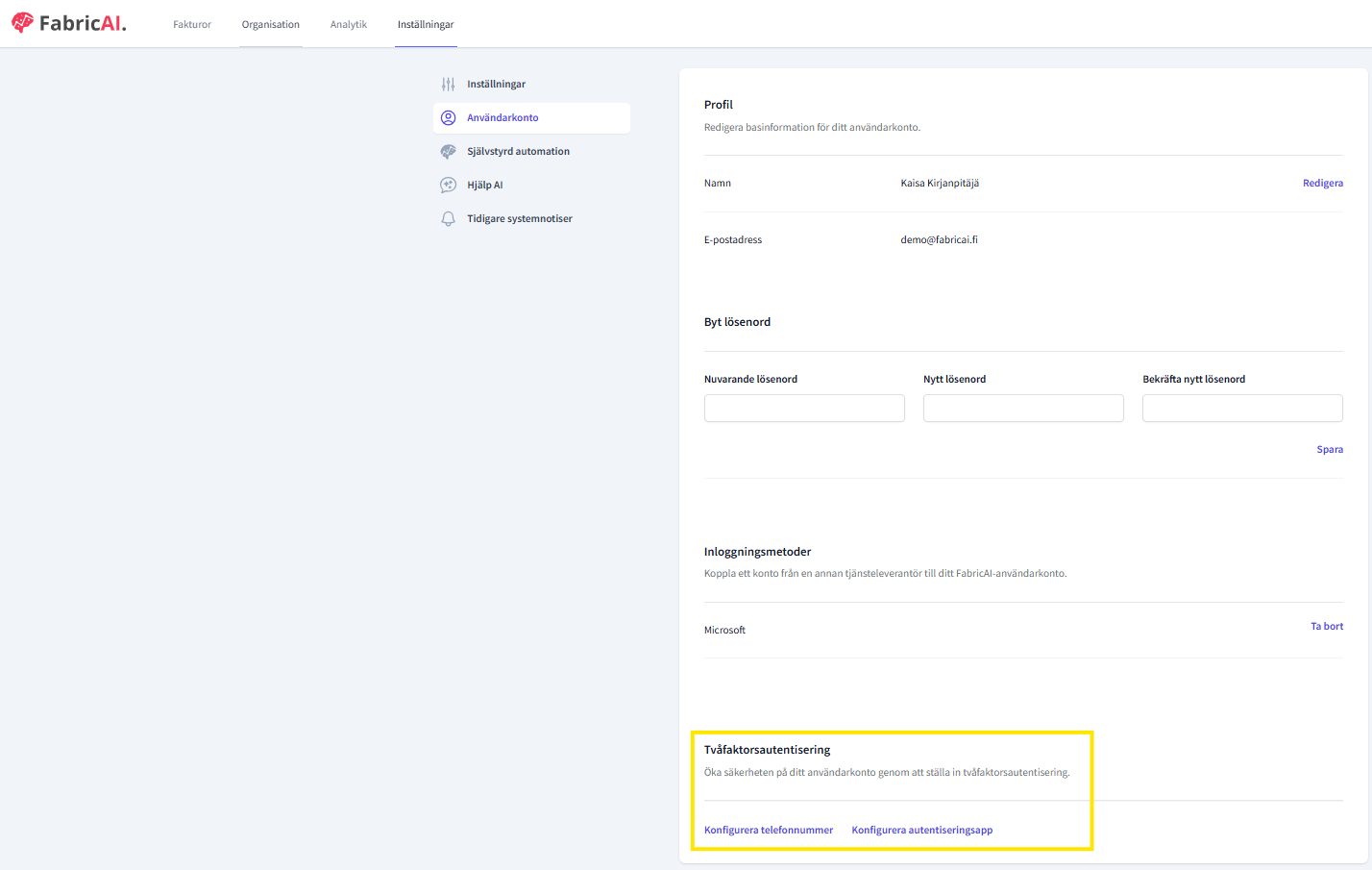 Så här aktiverar du tvåfaktorsautentisering i FabricAI-portalen