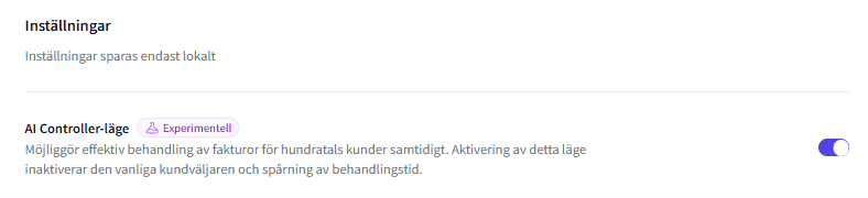 Välj ”Inställningar” i övre vänstra hörnet efter att du har loggat in i FabricAI-portalen. Inställningar öppnas i vyn ”Inställningar”. Högst upp i inställningarna finns ”AI Controller”-läge. Kryssa i valpanelen till höger som på bilden för att aktivera läget.