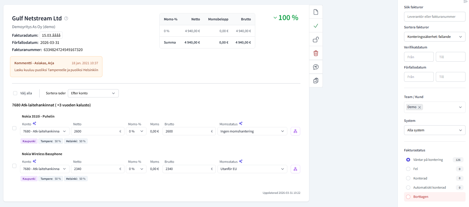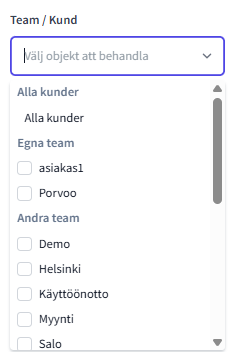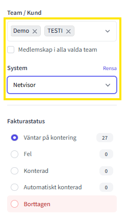 När du har valt till exempel ett visst team som aktivt, får du i fakturakön se alla fakturor i ”Väntar på kontering”-status för det teamets kunder. Du kan också se alla fakturor i ”Fel”-status för dessa kunder.