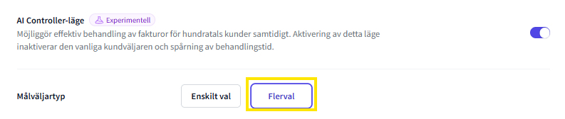 Den 18.12.2025 publicerades en uppdatering i FabricAI-portalen, vilket gör det möjligt att i AI Controller-läge välja flera team eller kunder att hantera samtidigt. Du kan aktivera denna funktion genom att välja "Målväljartyp" -> "Flerval" under Ai controller-läge i inställningarna.