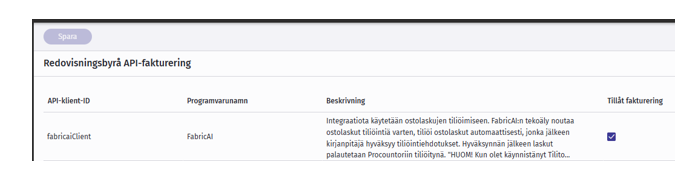 Bokföringsbyrå-API är en alternativ prissättningsmodell för bokföringsbyråer. Den innebär att FabricAI-gränssnittsavgiften som debiteras av Finago tas bort från bokföringsbyråns kundfaktura. Faktureringen sker enligt läget den sista dagen i månaden. En bokföringsbyrå kan endast använda denna faktureringsmodell antingen för samtliga sina FabricAI-kunder eller inte alls.