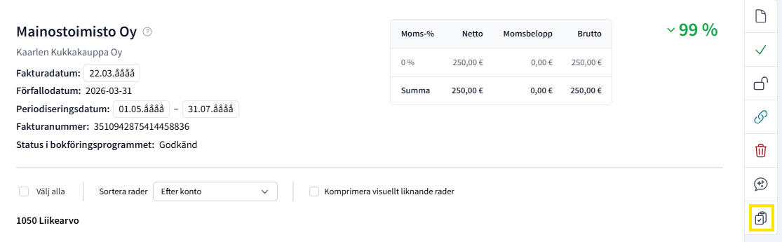 Redovisningsassistenten finns i menyn till höger på varje faktura:
