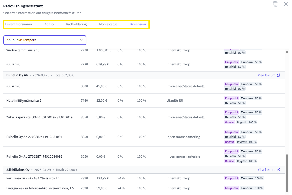 - “Leverantörsnamn” – först öppnas konteringar av tidigare fakturor från den aktuella leverantören (från vilken funktionen har öppnats). Här är det bra att notera att vyn endast gäller konteringar gjorda via FabricAI. I denna vy ser du alltså de bokföringskonton som valts för tidigare fakturor från den aktuella leverantören, fakturaradernas momshantering, summor samt valda dimensioner från tidigare fakturor. Detta underlättar bestämningen av konteringen för den faktura som är under behandling, eftersom du kan se hur tidigare fakturarader från den aktuella leverantören har bokförts. Från denna flik kan du också vid behov söka fakturor från en annan leverantör baserat på leverantörens namn.