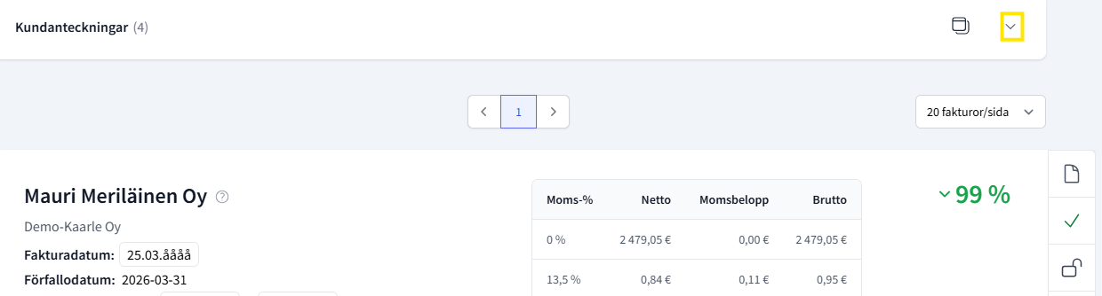 Funktionen finns ovanför fakturalistan under Kundanteckningar.