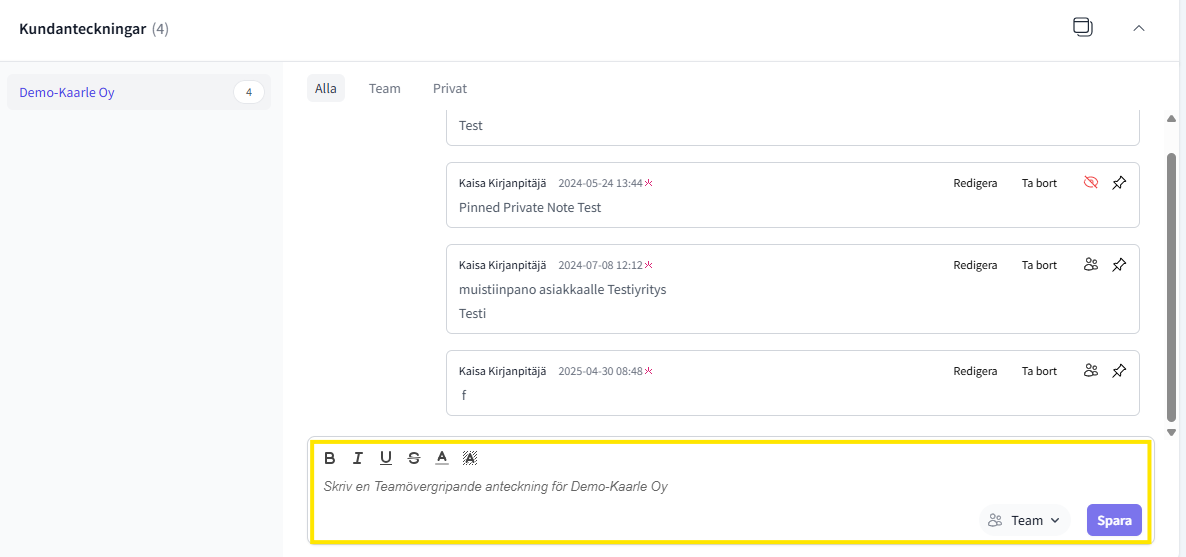 Team: Anteckningen syns för alla användare som har rättigheter till den aktuella kunden. Detta passar utmärkt för instruktioner, såsom: "Kom ihåg delvis moms-avdragsrätt 65 % på K-Rautas fakturor."
