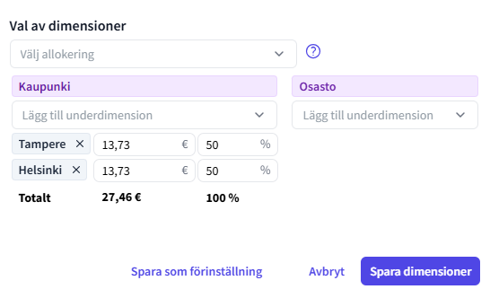 Knappen öppnar ett dimensionsvalsfönster där det också är möjligt att dela upp fakturans i delar för olika dimensioner, till exempel som procentandelar. Läs mer om fördelningar i FabricAI här.