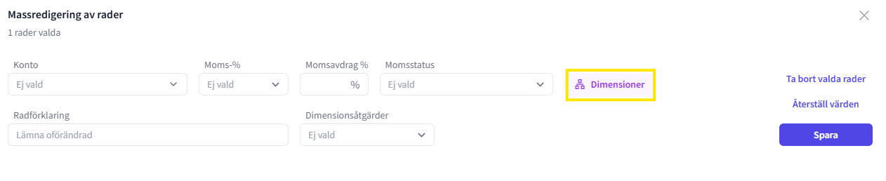 Du kan även lägga till kostnadsställen som massbearbetning genom att välja flera rader och klicka på samma knapp för dimensionsval i masseditorn som öppnas i sidans nederkant.