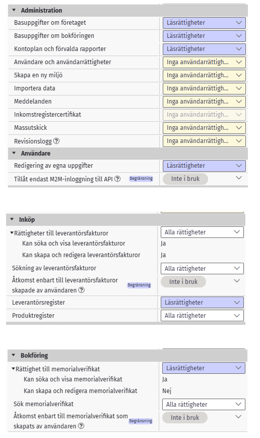 - Administration>Basuppgifter om bokföringen: Läsrättigheter