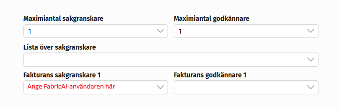För att processen ska fungera optimalt måste bokföraren/reskontraskötaren som använder FabricAI vara den första i cirkulationen för alla fakturor. Detta är förnuftigt eftersom fakturorna ofta först vill hållas kvar i FabricAI-portalen (och Procountor) innan de skickas vidare. Dessutom kan det uppstå situationer där fakturan måste hanteras i Procountor istället för FabricAI. Inställningarna är ofta redan korrekt konfigurerade för detta om samma person tidigare har styrt fakturorna till rätt granskingslistor i Procountor. Obs! Du kan också lämna standardcirkulationen tom om du tycker att det är bättre.