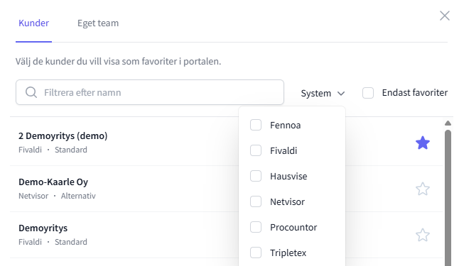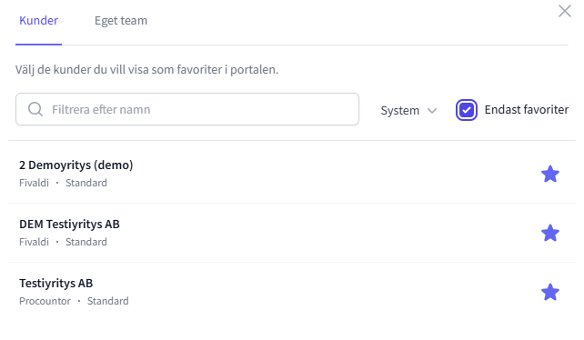 - När du har flera kunder och vill ta bort dem, rekommenderar vi att du markerar "Endast favoriter" i menyn. Då visas endast de kunder du har valt som favoriter i menyn (inte andra kunder i ditt team) och det blir lättare för dig att ta bort dem.