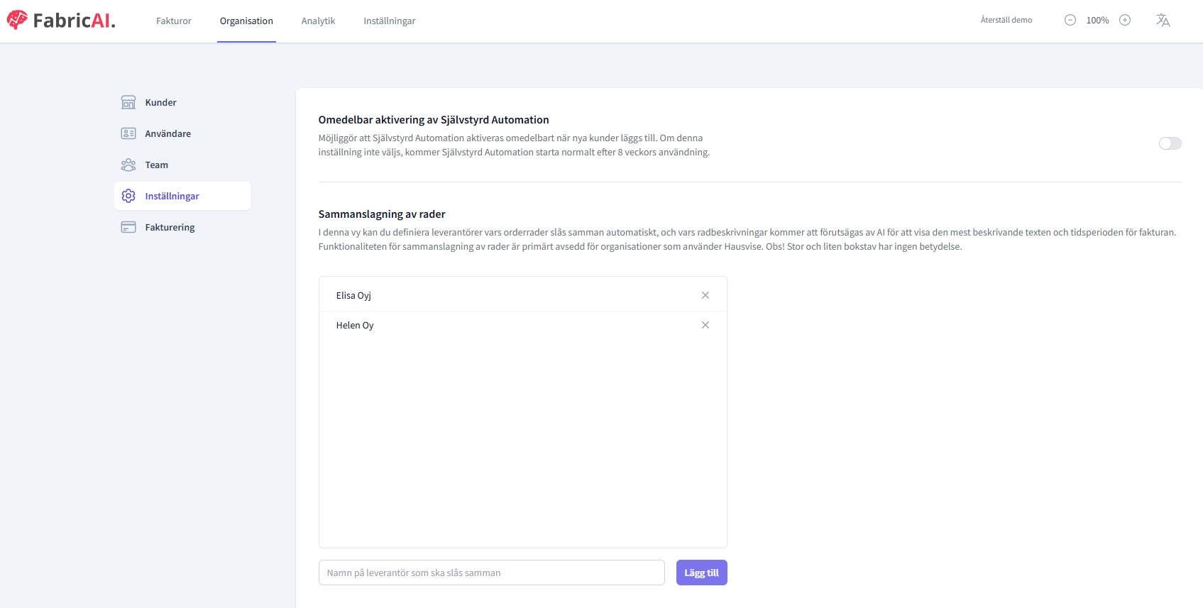 På FabricAI-portalens ”Organisation”-flik under ”Inställningar”-menyn kan organisationsadministratören definiera för hela organisationen vilka leverantörer, vars rader automatiskt reduceras för alla kunder innan fakturorna stiger till FabricAI-portalen.
