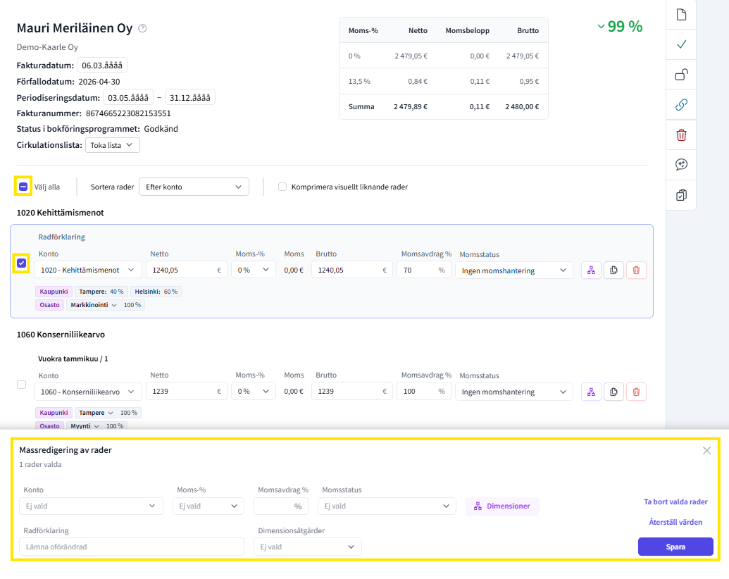 FabricAI-portalen har en massredigerare som är bra att använda när alla fakturarader eller flera rader ska behandlas på samma sätt.
