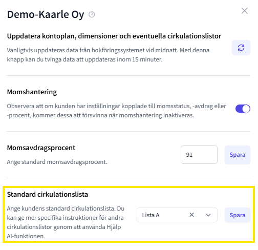 Hjälp AI-funktionen har fått en utökning den 6.11.2025, där AI kan instrueras även vid inställning av cirkulationslistor. Läs mer om Hjälp AI-funktionen här. Denna utökning är avsedd för kunder som använder Alternativ med cirkulation-processen (läs mer om processer här.)