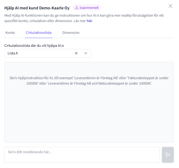 3. Välj från rullgardinsmenyn den cirkulationslista du vill automatisera. Du kan skriva en hjälpinstruktion till AI på samma sätt som vid kontoinstruktioner. Dessutom kan AI instrueras specifikt för cirkulationer även baserat på förutsagd dimension eller konto, exempelvis med sådana hjälpinstruktioner: